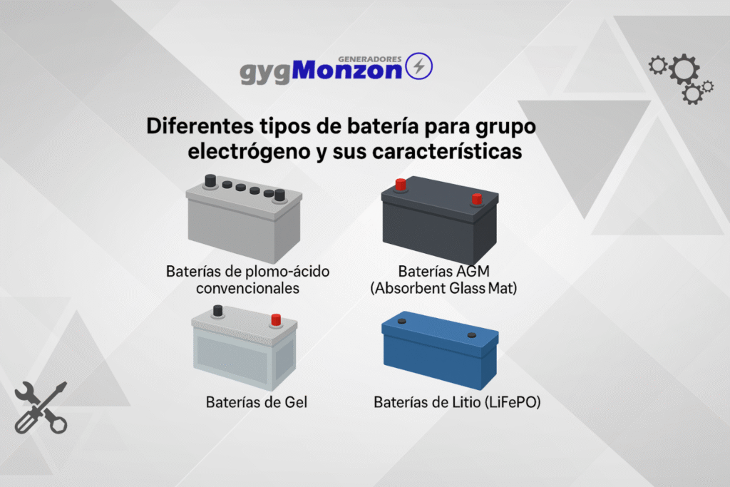 Descubre los diferentes tipos de batería para grupos electrógenos (plomo-ácido, AGM, Gel y Litio), sus características, ventajas y cuál elegir según tu aplicación.