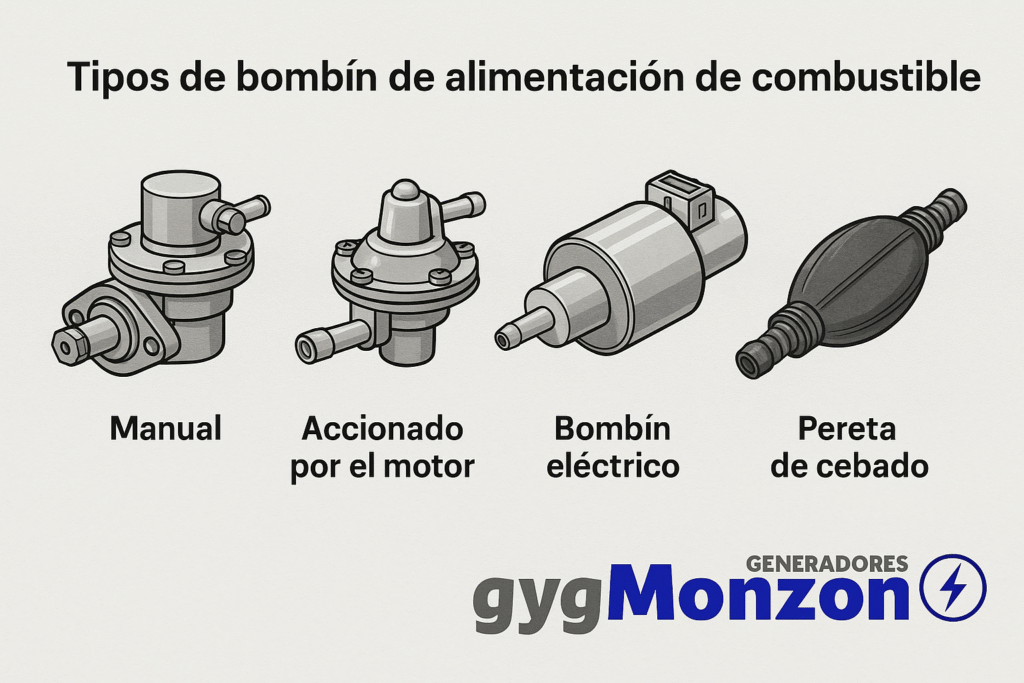 Los tipos de bombín de alimentación de combustible más comunes son el manual (pera de cebado), el mecánico accionado por el motor, el eléctrico (in-tank o inline) y los sistemas de alimentación por gravedad. La elección dependerá de la ubicación del tanque, la frecuencia de uso del motor y la tecnología de inyección que utilice. En gygMonzón empleamos bombas y sistemas de alimentación adaptados a cada grupo electrógeno, garantizando cebado rápido, fiabilidad y larga vida útil.